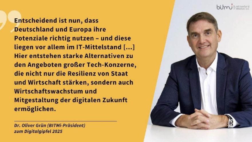 Der erste Digitalgipfel des Ministeriums für Digitales und Staatsmodernisierung findet nächste Woche gemeinsam mit Frankreich unter dem Leitmotiv „European Digital Sovereignty“ statt. Aus Sicht des Bundesverband IT-Mittelstand e.V. (BITMi) setzt…
