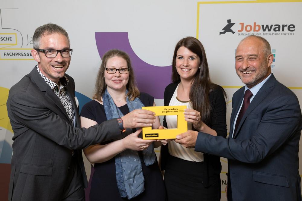 In Deutschland gibt es mittlerweile über 4.000 Fachzeitschriften. Die dafür verantwortlichen Fachverlage konnten ihre Medien dieses Jahr in elf Sachkategorien ins Rennen um den Titel „Fachmedium des Jahres“ schicken. Eine Fachjury bewertet in einem mehrstufigen Prozess die Einreichungen und ermittelt den Sieger der jeweiligen Kategorie. Das Fachmedium „DeviceMed“ überzeugte in der Kategorie „Beste Fachzeitschrift (über 1,0 bis 2,5 Mio. Euro Umsatz)“.