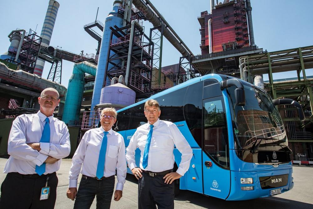 Mit den Vorteilen, die ein eigener, flexibel einsetzbarer Bus mit sich bringt, ist gleichzeitig ein Mehrwert für drei thyssenkrupp-Beschäftigte verbunden. Am Steuer sitzen nämlich nun nicht mehr angemietete Fahrer, sondern eigene Mitarbeiter des Stahlherstellers. Alle Drei haben sich in einem mehrmonatigen Kurs zum Busfahrer aus- bzw. weiterbilden lassen und eigens den Bus-Führerschein gemacht. Zwei von ihnen sind leistungsgeminderte Mitarbeiter, für die damit ein neues Einsatzgebiet geschaffen wurde. „Wir versuchen durchgehend, Arbeitstätigkeiten wieder ins Haus zu holen und so eigene Mitarbeiter sinnvoll zu beschäftigen“, betont Thomas Schlenz. „Durch diese Maßnahme kann der Umfang externer Anmietungen von Bus- und Fahrerkapazitäten für Werkführungen deutlich verringert und Aufgaben nun durch interne Kräfte abgewickelt werden“, so der Personalvorstand der thyssenkrupp Steel Europe AG.