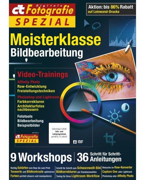 Auf der DVD zur Meisterklasse Bildbearbeitung finden sich praktische Tutorials sowie diverse kostenfreie Foto-Tools und Bildbearbeitungs-Programme. Beispielbilder, um die Workshops in den Artikeln direkt nachvollziehen zu können, runden das Angebot ab. Das Sonderheft der c’t Fotografie kostet 12,90 Euro. Die digitale Version kostet 9,99 Euro. Man bekommt sie über die c’t-Fotografie-App für Android und iOS sowie als PDF-E-Paper.