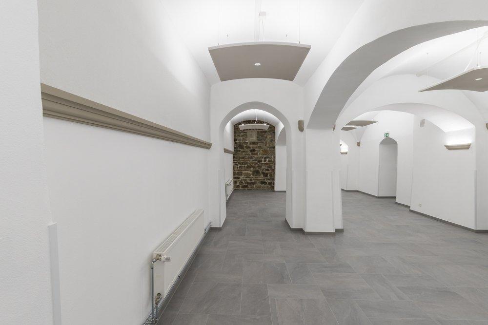 „Urig ist unser Schlosskeller mit seiner verschachtelten Architektur, den Säulen, Bögen und Kreuzgewölben ja schon immer gewesen. Aber so richtig heimelig war es in den letzten Jahren dort nicht: zu feucht, zu kalt, zu laut, und die Beleuchtung mit Einzelleuchten stammte aus den 1970er Jahren“, berichtet Geschäftsführer Michael Laufer. Seit mehr als 50 Jahren habe es in der Mensa keine Grundsanierung gegeben, die also längst überfällig gewesen sei. Oberste Prämisse war die Feuchtigkeit in den Wänden mit den Begleiterscheinungen wie Salzausblühungen im Sockelbereich mit einem Sanierputz in den Griff zu bekommen. Außerdem galt es, Akustik und Beleuchtung zu verbessern. Armdicke alukaschierte Heizungsrohre, die über dem Putz verlegt waren, sollten hinter einer Vormauerung verschwinden. Um diese Aufgabe zu lösen, beauftragte man den Objekt-Planer Stefan Raffauf aus Bad Honnef.