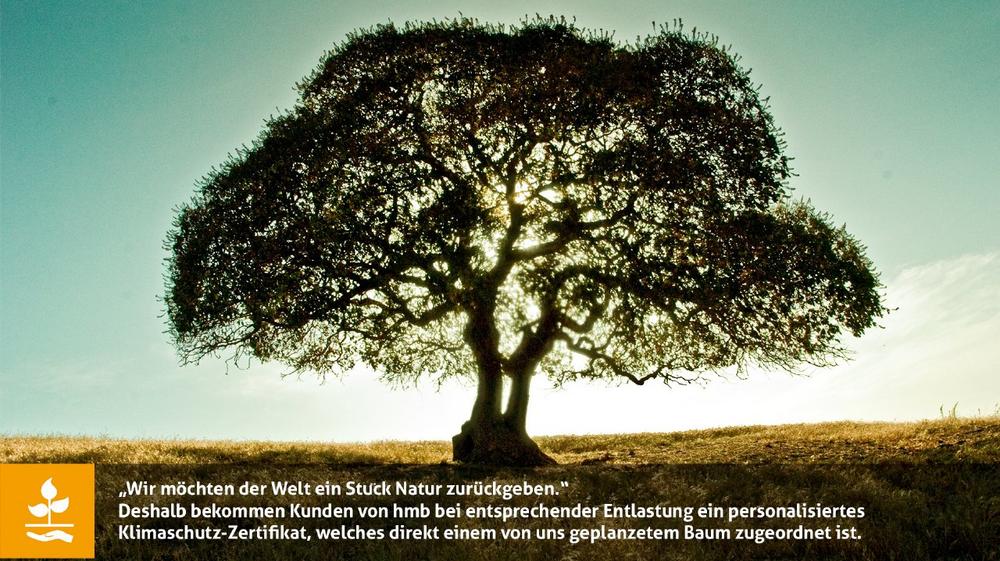 „Wir möchten der Welt ein Stück Natur zurückgeben.“ Deshalb bekommen Kunden von hmb bei entsprechender Entlastung ein personalisiertes Klimaschutz-Zertifikat, welches direkt einem Baum zugeordnet ist.