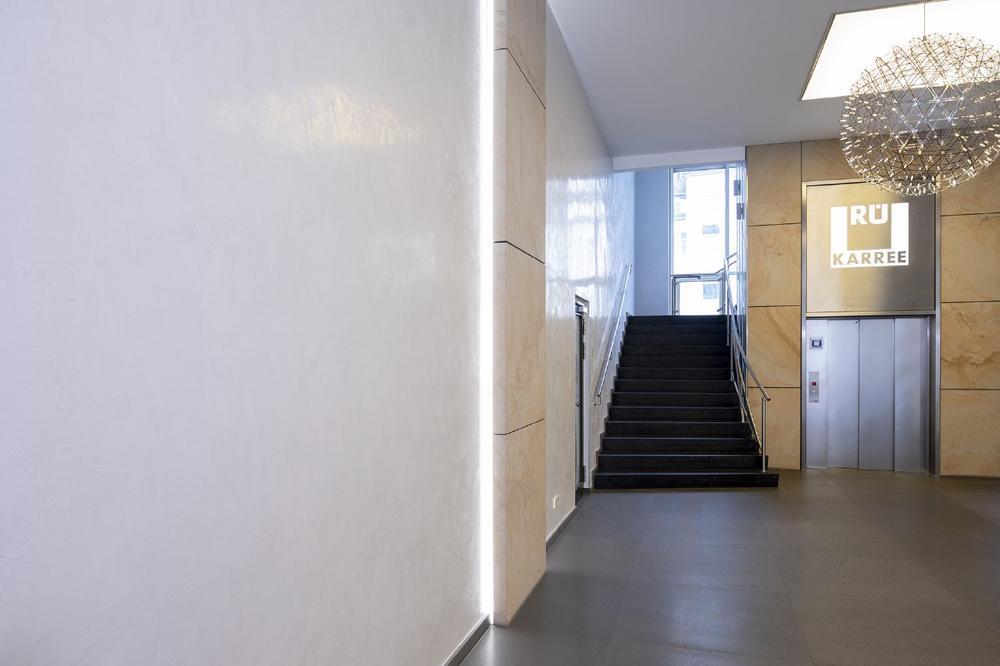 So beeindruckt das Rü-Karree nicht nur äußerlich mit seiner historischen Sandsteinfassade, die mit Stahl- und Glaselementen kombiniert wurde, sondern zieht auch im Inneren mit exklusiven, spiegelglänzenden Wandoberflächen in den Treppenhäusern die Blicke der Betrachter auf sich.