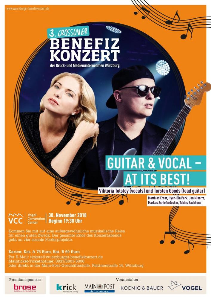 Das dritte Crossover-Benefizkonzert findet am Freitag, den 30. November 2018 statt. Ab 19:30 Uhr tauchen Torsten Goods und Viktoria Tolstoy das Vogel Convention Center in eine vielgestaltige Welt aus „Guitar & Vocal at its best“. Mit einem speziell für diesen Abend zusammengestellten Programm und einer Musikerbesetzung, die ebenfalls erstmalig in dieser Formation zusammen auftreten wird.