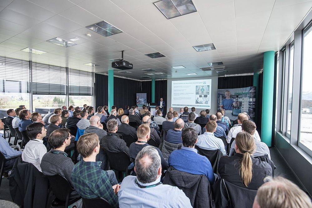 Nach der Mittagspause mit kulinarischen Leckerbissen erhielten die BesucherInnen bei der Betriebsführung Einblicke in die Produktion der hochwertigen Meusburger Normalien und konnten in Kleingruppen einen spannenden Blick hinter die Kulissen der Fertigungsprozesse werfen. In weiterer Folge standen noch Fachvorträge von Dominic Gruß (Phoenix Feinbau) zum Thema Sensorik und Aktorik in Stanzwerkzeugen und Thomas Enz (Meusburger) über die Standardisierung von Werkzeugkonzepten auf dem Programm.