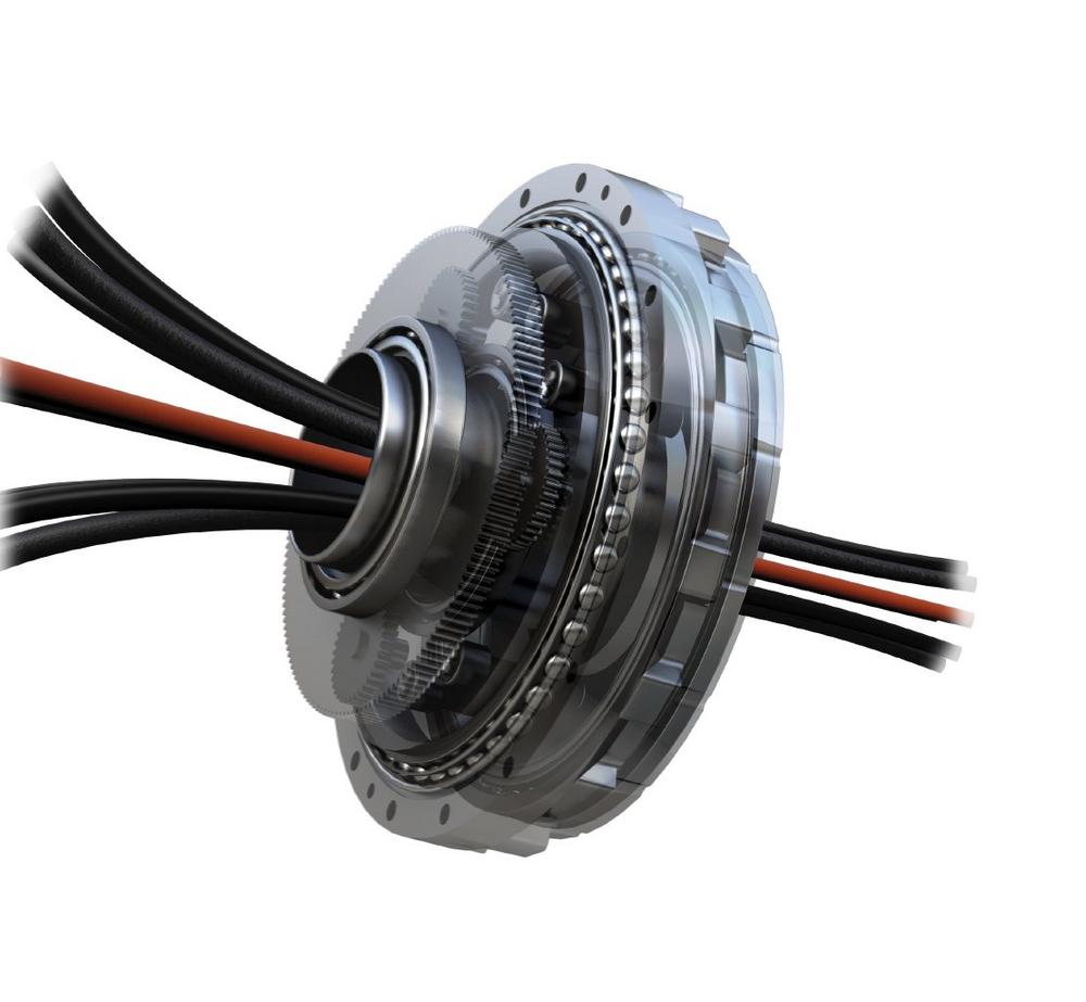 Erfordert eine Anwendung eine besonders gewichtsreduzierte Konstruktion oder müssen Kabel und Schläuche verlegt werden, setzen Konstrukteure in der Regel auf Hohlwellengetriebe. Diese sind zwar bei gleicher Drehmomentleistung etwas größer als Vollwellengetriebe, bieten aber in vielen Fällen entscheidende Vorteile. So sorgt der Hohlraum im Inneren für deutliche Gewichtseinsparungen und ermöglicht außerdem, Daten- und Versorgungsleitungen sowie Antriebswellen platzsparend durch die Mitte des Getriebes hindurchzuführen. Zudem verfügen Hohlwellengetriebe über größere Hauptlagerungen als Getriebe mit Vollwelle, was sich positiv auf ihre Belastbarkeit auswirkt.