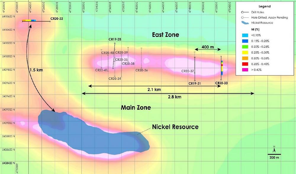 - Die Bohrung CR20-32 erweiterte die Nickelvererzung in der Main Zone um 1,5 km in Streichrichtung nach Norden (auf 3,2 km) und lieferte 243 m mit 0,25 % Nickel und 0,013 % Kobalt ab 390 m Tiefe und endete in der Vererzung, wobei die letzten 57 m der Bohrung einen Gehalt von 0,30 % Nickel und 0,013 % Kobalt hatten. (Analyseergebnisse aus dem PGM-Teil dieser Bohrung wurden in Canada Nickels Pressemitteilung vom 19. Mai 2020 veröffentlicht.)