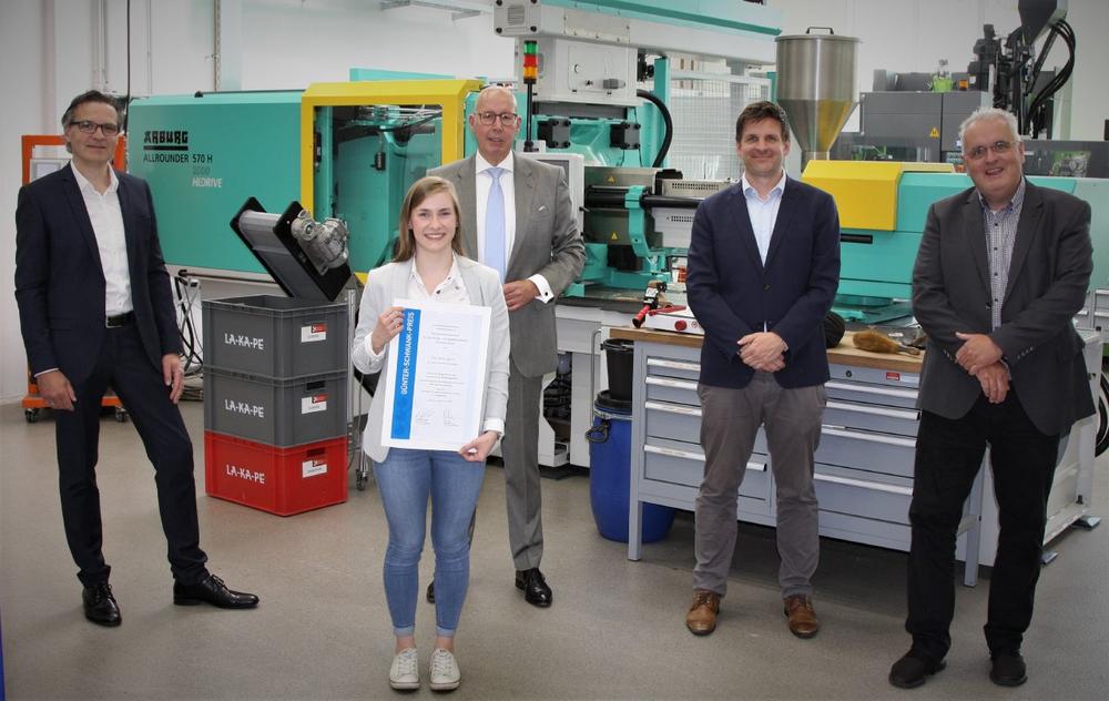 Ralf Olsen, Hauptgeschäftsführer des pro-K Industrieverbandes Halbzeuge und Konsumprodukte aus Kunststoff e. V. und verantwortlich für die Bildungspolitik und Berufsbildung in der Kunststoff verarbeitenden Industrie, überreichte Alina Spenst im Hause des Kunststoff-Instituts Lüdenscheid die Ehrenurkunde. Zentraler Bestandteil des Günter-Schwank-Preises ist neben der Auszeichnung von Alina Spenst auch die Anerkennung und Würdigung des ausbildenden Unternehmens Kunststoff-Institut Lüdenscheid (KIMW) sowie der beteiligten Berufsschule Berufskolleg für Technik (BKT) des Märkischen Kreises.