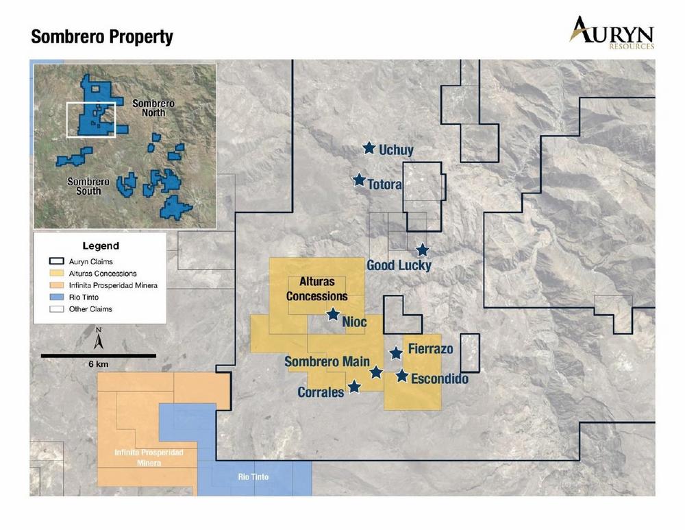 Die Liegenschaft Sombrero befindet sich im Süden Perus, etwa 345 Kilometer südöstlich von Lima. Sie umfasst über 130.000 Hektar, von denen die Alturas-Option 4.600 ha einnimmt. Auryn glaubt, dass Sombrero in einem nordwestlichen Ausläufer des Kupfer-Gold-Porphyr- und Skarngürtels Andahualylas-Yauri beherbergt ist, in dem sich die Lagerstätten Las Bambas, Haquira, Los Chancas, Cotambambas, Constancia, Antapaccay und Tintaya befinden.