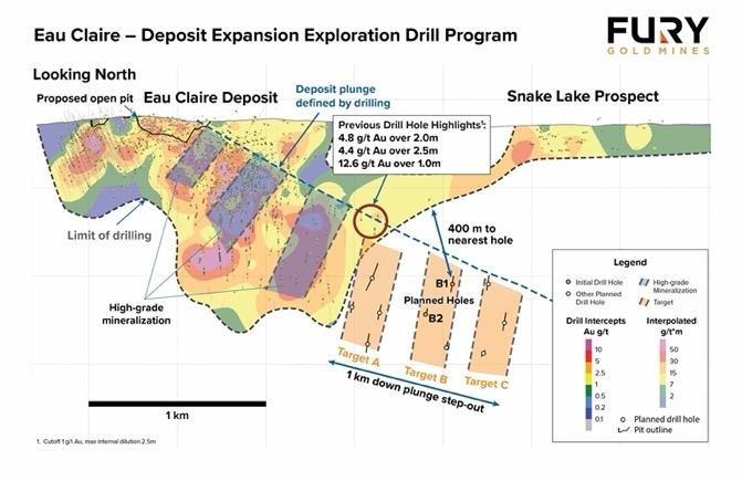 Ein bedeutendes Ziel, bei dem Fury das Bohrstadium erreicht hat, befindet sich am Schnittpunkt der mineralisierten Lagerstätte Eau Claire und den südlichen Tonalitstrukturen (Abbildung 3). Diese strukturelle Durchschneidung kommt in einer Tiefe von etwa 300 bis 500 Metern vor und wurde noch nicht gebohrt. Er ist wie folgt charakterisiert: 1) Aktinolith – Turmalin-Alteration in Basalten mit zugehörigen felsischen Gängen am Tonalitrand der Eau Claire-Lagerstättenstruktur mit Oberflächenschürfproben von bis zu 2,6 g/t Gold; und 2) Quarz – Turmalin-Aderung in Basalten und Sedimenten mit zugehörigen felsischen Gängen entlang der South-Tonalit-Struktur mit Schürfproben von bis zu 7,8 g/t Gold.