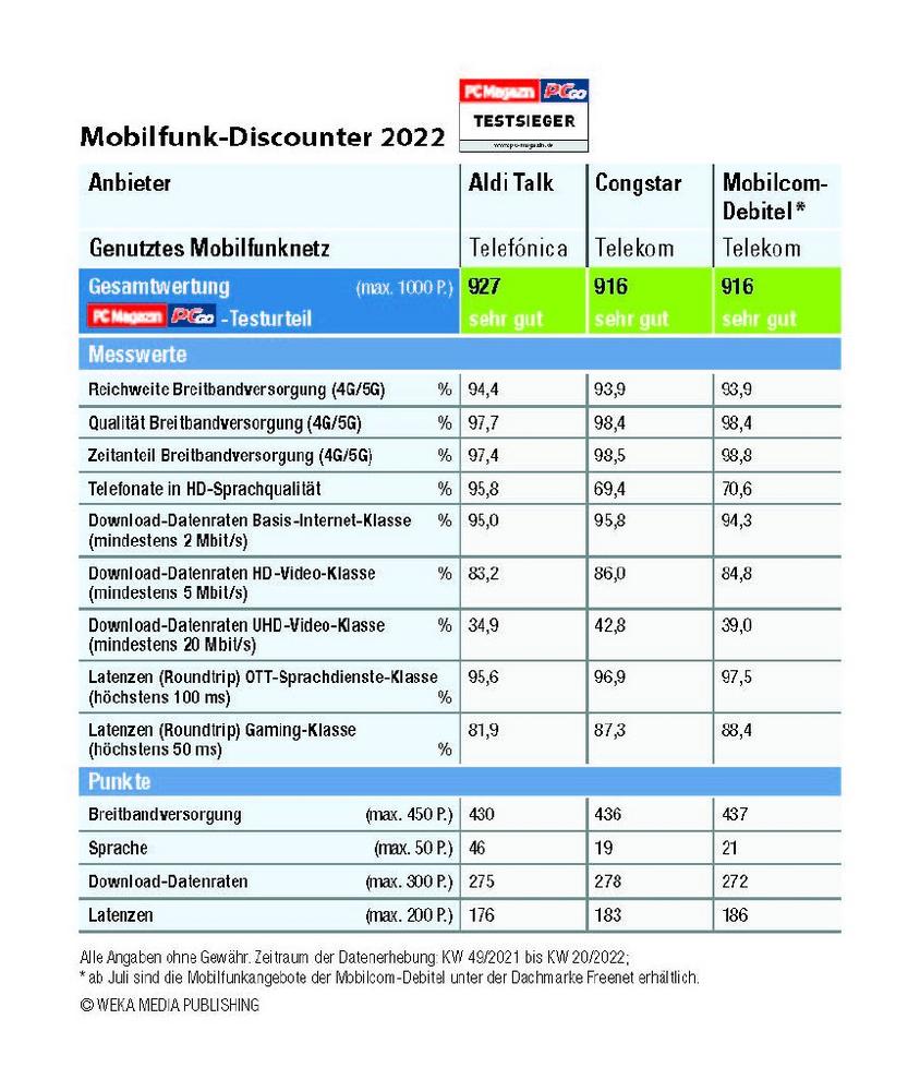 „Besser geht‘s fast nicht: Alle untersuchten Mobilfunkanbieter verdienen sich – bis auf eine Ausnahme – die Gesamtnote „sehr gut“. Offensichtlich kommt die Erhöhung der LTE-Kapazitäten infolge der 3G-Abschaltung auch bei den MVNOs an. Am Ende kann es aber nur einen geben: Gewinner ist Aldi Talk mit Telefónica als Netzpartner. Congstar und die Telekom-Angebote von Mobilcom-Debitel folgen gleichauf. Klarmobil, im Telekom- und Vodafone-Netz, Netzclub und Otelo können sich im engen Mittelfeld ebenfalls etwas nach oben absetzen“, sagt Joachim Bley, Autor des PC Magazins.