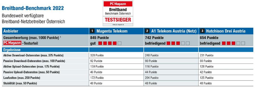 Die Fachzeitschrift PC Magazin hat in Kooperation mit dem Infrastruktur- und Benchmarkingspezialist umlaut, Teil von Accenture, zum vierten Mal in einem umfassenden Breitband-Benchmark die Leistungen der Internetzugänge in den österreichischen Haushalten überprüft. Dabei steht das Interneterlebnis zuhause im Fokus, ganzheitlich und aus Anwendersicht. Untersucht wurden die bundesweit aktiven Netzbetreiber A1 Telekom, Hutchison Drei und Magenta Telekom. Das Ergebnis: Magenta Telekom verteidigt erneut den Sieg, A1 Telekom folgt auf Platz zwei und Hutchison Drei erreicht den dritten Platz. Darüber hinaus kürt der Benchmark die besten Internet Service Provider in den bevölkerungsreichsten Bundesländern, in denen die regionalen Breitbandkabel- und Glasfaseranbieter für zusätzlichen Wettbewerb sorgen. Hier überzeugen Kabelplus, Liwest und Salzburg AG mit dem besten Internet-Nutzererlebnis in ihren Regionen.
