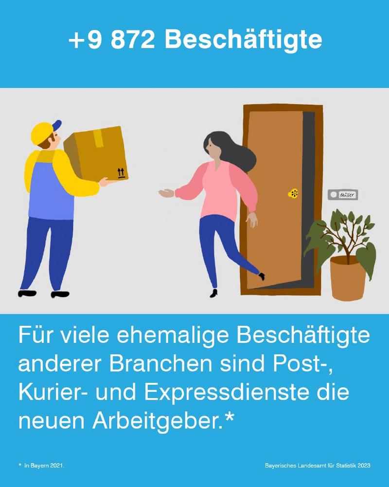 Sind die Beschäftigten aus der Gastronomie direkt zu den Post- und Kurierdienstleis-tern abgewandert? Darauf antwortet das Expertenteam des Landesamts: „Die Beschäftigtenrückgänge in der Gastronomie sind bayernweit mehr als dreimal so hoch wie die Zunahme bei den Post- und Kurierdienstleister. Wir können zwar im direkten Umfeld von Standorten der Post- und Kurierdienstleister eine Abnahme bei den Beschäftigtenzahlen der Gastronomie feststellen. Deutliche Beschäftigtenrückgänge in der Gastronomie gibt es aber auch in bayerischen Städten, in denen die Beschäftig-ten von Post- und Kurierdienstleistern nicht zugenommen haben. Es ist wohl eher so, dass besonders in urbanen Regionen sehr viele Gastronomiebetriebe vorhanden sind, die Beschäftigte eingebüßt haben. Gleichzeitig ist der Kundenkreis für Post- und Kurierdienstleister in den Städten sehr umfangreich und bietet Wachstumspotenziale.“