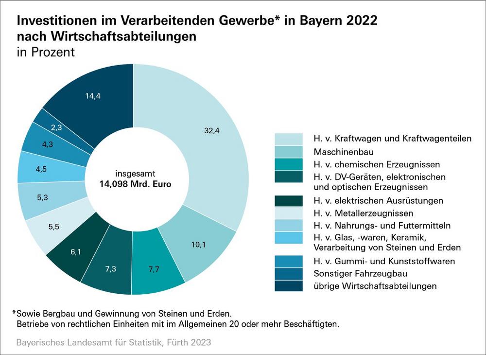 Investitionsstärkster Wirtschaftszweig in Bayern ist auch im Jahr 2022 die „Herstellung von Kraftwagen und Kraftwagenteilen“. Deren Anteil am gesamten bayerischen