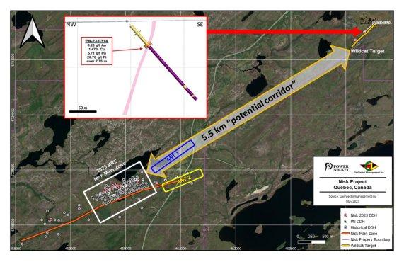 Genauer gesagt wird das zweite Bohrgerät auf Stepout-Bohrungen unserer beeindruckenden Bohrung PN-23-031A abzielen, die 7,75 Meter mit über einer Unze PGM lieferte. Das Ziel Wildcat befindet sich ganze 5,5 Kilometer von Nisk Main entfernt. Die die oben erwähnte MRE 2023 wurde für die Lagerstätte Nisk Main erstellt (siehe Abbildung 1 unten).“