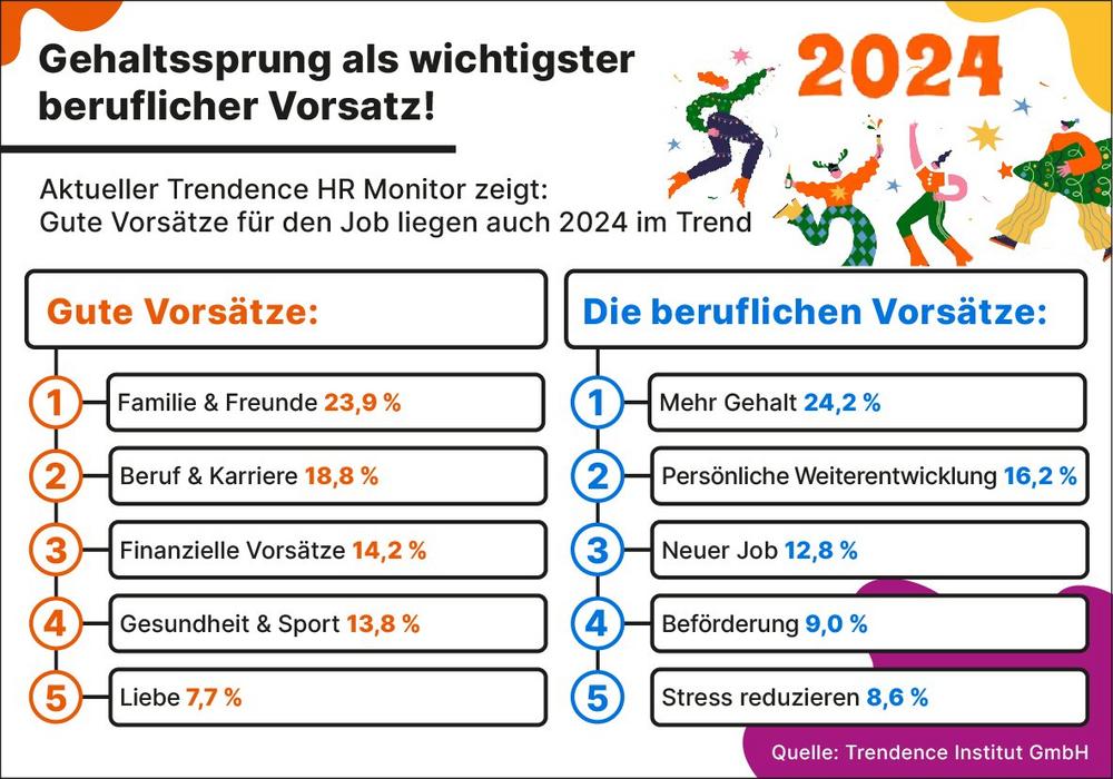 Wenn es darum geht, was genau auf der beruflichen Agenda für das Schaltjahr 2024 steht, haben Beschäftigte vor allem eine Gehaltserhöhung im Sinn. 24,2% möchten im neuen Jahr mehr verdienen. Gleich danach folgt die Zielsetzung, sich persönlich weiterzuentwickeln (16,2%). Einen konkreten Jobwechsel streben indes 12,8% der befragten Arbeitnehmer*innen an. Weitere 5,3% geben allerdings darüber hinaus an, 2024 eine ergebnisoffene Jobsuche zu starten. Weniger hoch im Kurs steht im Vergleich das Vorhaben, sich mehr Freizeit zu gönnen. Die viel beschworene Work-Life-Balance steht aktuell „nur“ bei 6.9% der Beschäftigten auf der persönlichen Agenda für das neue Jahr.