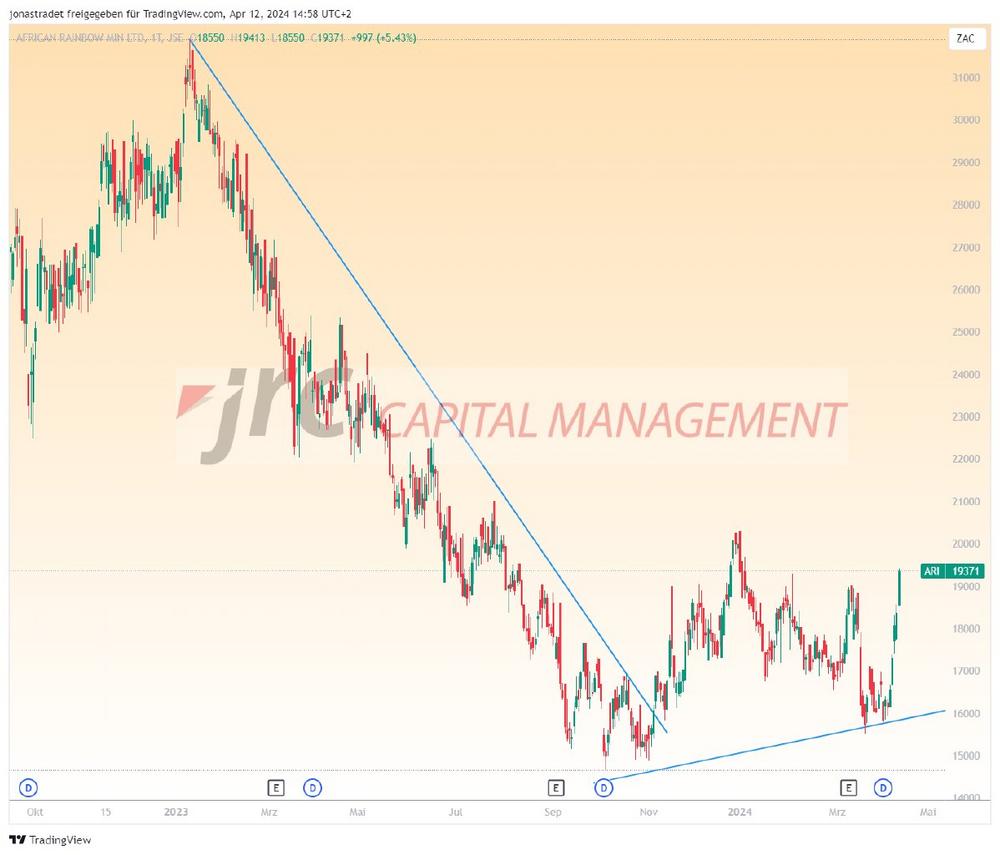 Seit dem letzten Hoch im Januar 2023 bei rund 32000 ZAC ist die Aktie bis zum heutigen Handelstag über 40% auf 19100 ZAC gefallen. Das Tief lag bei rund 14700 ZAC im November 2023. Grund für den rapiden Abstieg des Titels sind deutliche Rückgänge in Umsatz und Gewinn des Bergbauunternehmens. Wurden im 1. Halbjahr 2023 noch 8.7 Milliarden ZAR (Südafrikanischer Rand) Umsatz und ein Nettoeinkommen von 4,4 Milliarden ZAR bekanntgegeben, waren es im 1. Halbjahr 2024 nur noch 5,8 Milliarden ZAR und ein Nettoeinkommen von 1,2 Milliarden ZAR .