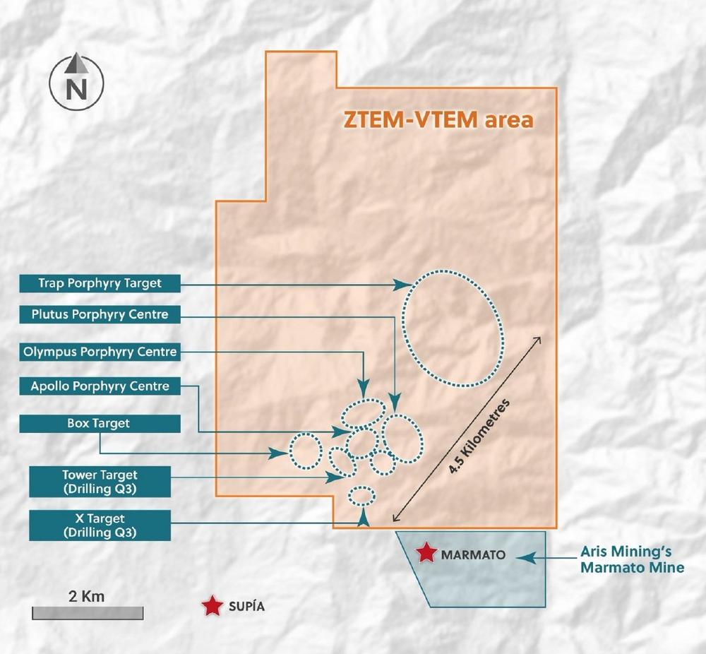 Das Vorzeigeprojekt des Unternehmens, Guayabales, ist im Apollo-System verankert, das das großflächige, hochgradige Kupfer-Silber-Gold-Wolfram-Porphyr-System Apollo beherbergt. Das Ziel des Unternehmens für das Jahr 2024 besteht darin, das Apollo-System zu erweitern, zu beweisen, dass sich die jüngsten Entdeckungen bei den Zielen Olympus und Trap zu großflächigen Systemen entwickeln, und eine neue Entdeckung entweder bei den Zielen Box, Tower oder X zu machen.