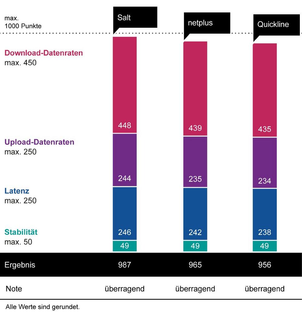 Bildunterschrift 2: Auf regionaler Ebene siegt Salt, gefolgt von Netplus und Quickline – alle Anbieter erreichen die Note „überragend“.