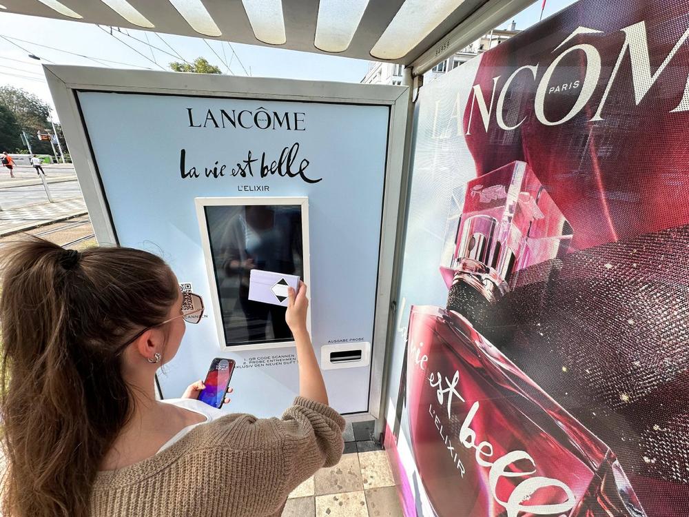 Herzstück dieser Sonderumsetzung war sowohl in Düsseldorf als auch in Wien die Ausgabe von Duftproben mittels eingebautem Dispenser. Dieser ließ sich durch Scannen eines QR-Codes und die Freigabe via Mobile Device aktivieren. Zur Auslösung des Dispensers wurde ein Werbevideo von Lancôme ausgespielt. Um die Sonderumsetzung in Wien multisensorisch abzurunden, war der eingebaute Dispenser um ein Soundmodul und einen Duftzerstäuber erweitert. Im Rahmen der Interaktion hatte der User schließlich noch die Möglichkeit, sich auf die Landing-Page eines ortsansässigen Retailers weiterleiten zu lassen. Die Herausforderung in der Umsetzung war es insbesondere, länderspezifische Restriktionen zu berücksichtigten und gleichzeitig agile Lösungen zu finden, die den Gesamtauftritt unterstützten.