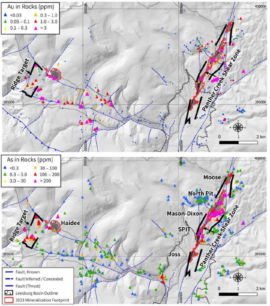 Anmerkung: 1 Zusammenstellung der geochemischen Gesteinsdaten beim Projekt Beartrack-Arnett. Die Daten zur Gesteinssplitterchemie stammen aus Proben, die im Laufe der Geschichte des Projekts entnommen wurden, darunter 107 Gesteinsproben, die am 13. November 2017 in einer Pressemeldung veröffentlicht wurden, 144 Proben, die zwischen 2019 und 2024 entnommen wurden, sowie 434 historische Gesteinsproben aus Dokumentenarchiven, die digitalisiert wurden. Die Proben umfassen sowohl repräsentative Gesteinssplitterproben als auch Proben aus historischen Minenhalden und sind nicht unbedingt repräsentativ für die In-situ-Mineralisierung.
