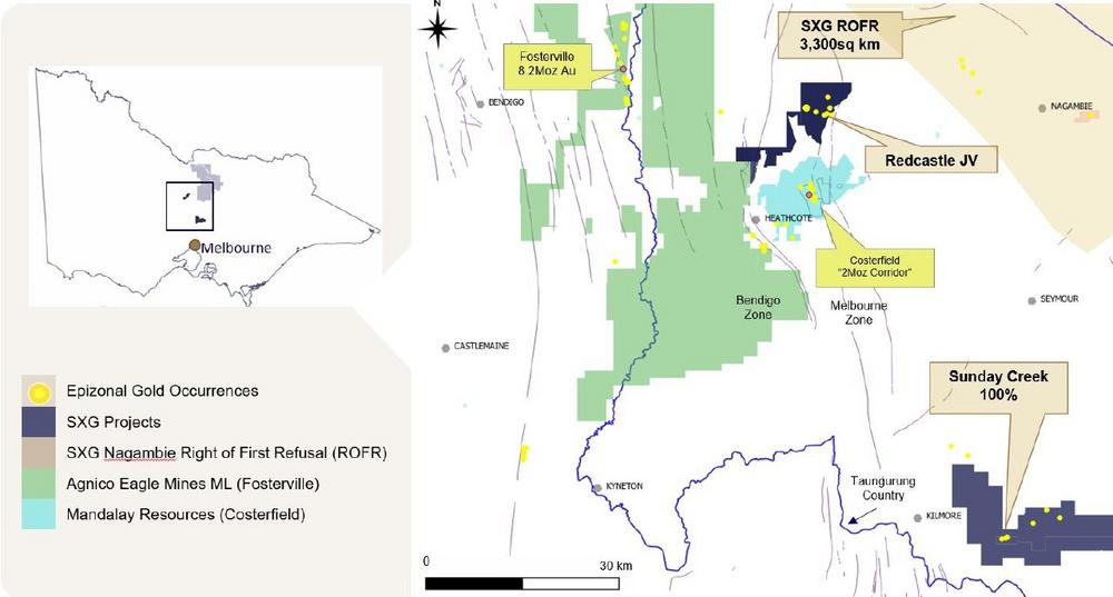 · Das Gold-Antimon-Projekt Redcastle befindet sich im Zentrum der Victoria Goldfields, etwa 120 km nördlich von Melbourne. Redcastle ist ein historisch bedeutendes Goldfeld mit einer hochgradigen Goldproduktion, die bis in die 1850er Jahre zurückreicht, und mit 17 km nicht erbohrten Reef-Systemen, die noch in die Tiefe erkundet werden müssen. SXG konzentriert sich weiterhin auf das Projekt Sunday Creek, das zu 100 % in seinem Besitz ist, während das Projekt Redcastle durch die Transaktion in den Besitz und die Kontrolle des Unternehmens übergeht.