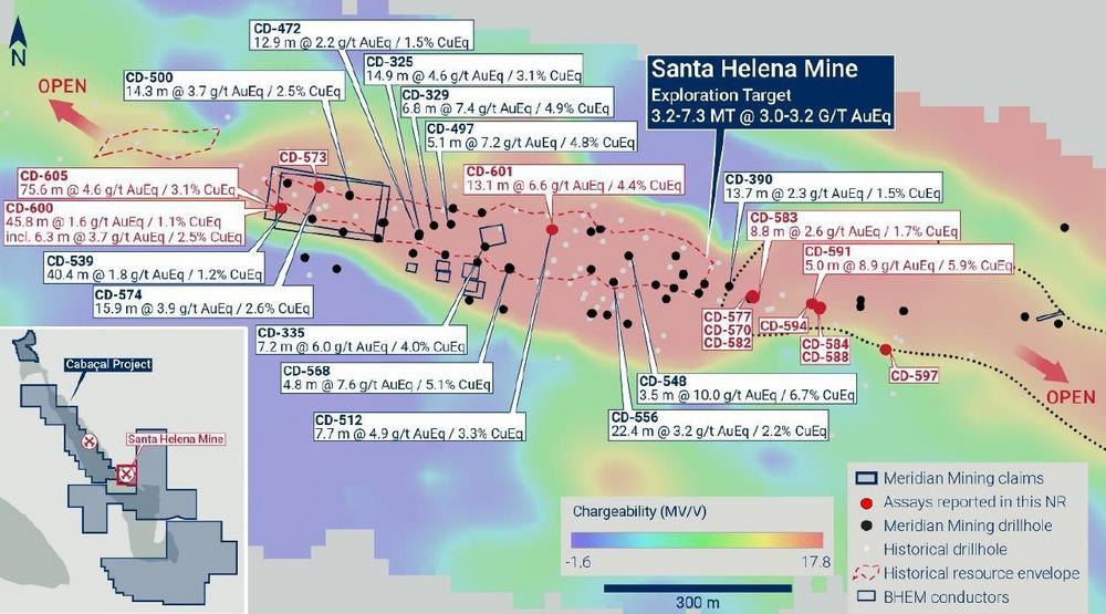 • Meridian’s CD-605 bohrt 75,6m @ 4,6g/t AuEq / 3,1% CuEq bei Santa Helena;