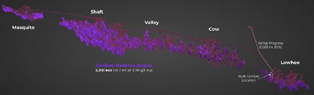 Im ersten Quartal 2024 begann das Unternehmen im Rahmen einer bestehenden Provinzgenehmigung mit einem unterirdischen Erschließungsstollen vom bestehenden Cow Portal in die Mineralienlagerstätte des Goldprojekts Cariboo in der Zone Lowhee. Das Ziel des Arbeitsprogramms mit Großproben ist die Erschließung des Erzkörpers und die Gewinnung einer Großprobe von 10.000 Tonnen mineralisierten Materials für den Abbau, die Erzsortierung und die Verarbeitungstests.
