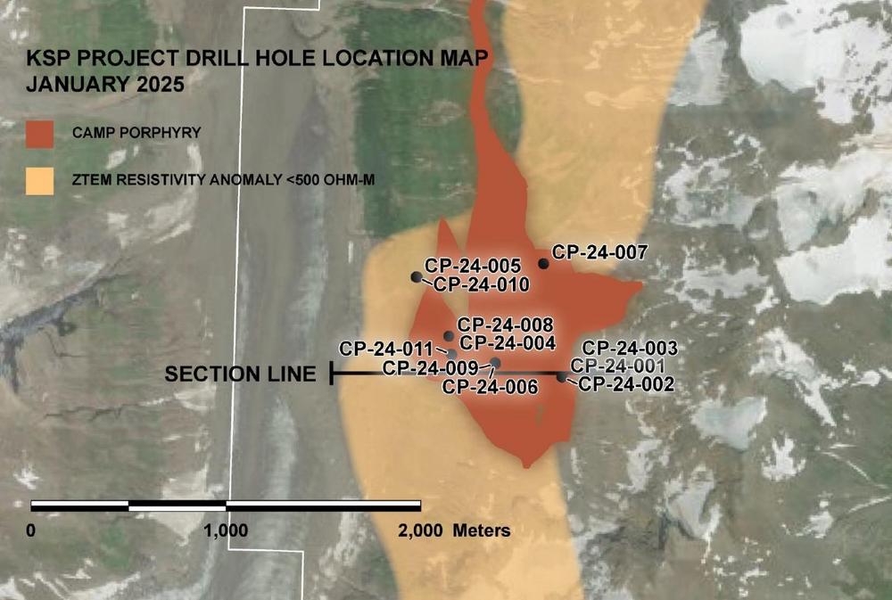 Das Bohrprogramm 2024 wurde durch eine luftgestützte ZTEM-Untersuchung ergänzt, die den nördlichen Teil des KSP-Projekts abdeckte. Das ZTEM-System ist eine luftgestützte elektromagnetische Plattform, die tief in den Untergrund eindringt und zur Unterscheidung von Widerstandskontrasten im Untergrund verwendet wird. Der Camp-Porphyr und die damit verbundene Mineralisierung weisen eine enge räumliche Verbindung und geometrische Ähnlichkeit mit einer großen ZTEM-Anomalie auf, die unterhalb des Porphyrs mit einer Streichenlänge von über 6.000 Metern auftritt.