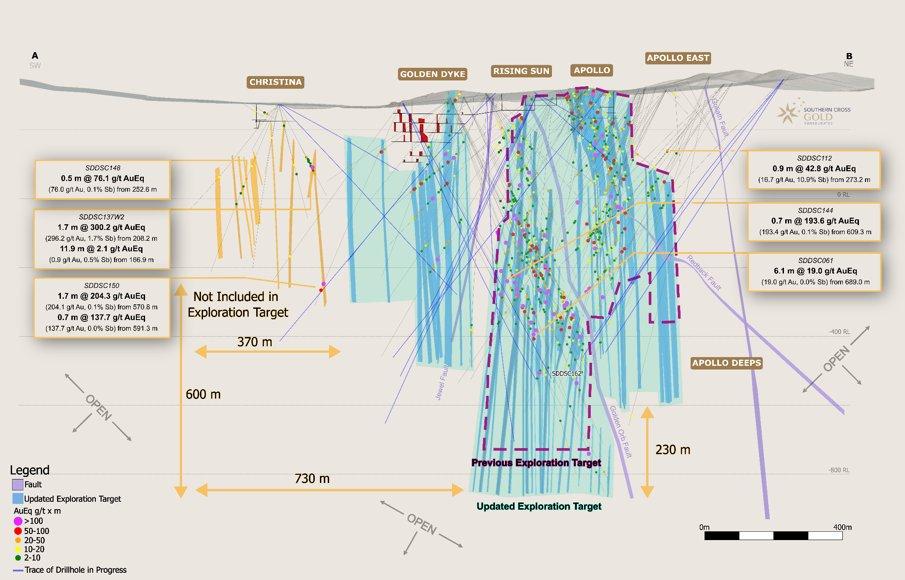 Tabelle 4 ). Für insgesamt 70 der Adersätze wurden die Gehalte anhand von zusammengesetzten Untersuchungsdaten geschätzt, während für 15 Adersätze der berechnete Durchschnittsgehalt von Rising Sun (7,8 g/t Au und 0,8 % Sb in Kleinbuchstaben und 11.5 g/t Au und 1,0 % Sb), Apollo (unterer Fall 3,8 g/t Au und 0,7 % Sb und oberer Fall 4,1 g/t Au und 0,7 % Sb) oder Golden Dyke (unterer und oberer Fall 5,6 g/t Au, 1,0 % Sb) und dies wurde auf das Explorationsziel angewendet. Die Bohrungen deuten darauf hin, dass Rising Sun höhere Gold- und Antimongehalte als Apollo und Apollo Deep enthalten könnte, wobei Golden Dyke noch nicht bis in die Tiefe erprobt wurde, um die Neigung zu höheren Gehalten zu bestimmen.
