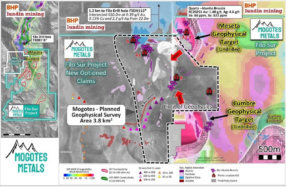 Mogotes hat eine umfangreiche 3D-Vektor-IP/MT- und tief eindringende IP/MT-Untersuchung über neu optionierte Claims 1 km südlich der Cu-Au-Ag-Lagerstätte Filo Del Sol von BHP und Lundin Mining eingeleitet, um die Erweiterungen der nicht bebohrten geophysikalischen Ziele Meseta und Cumbre von Mogotes in Chile zu testen (siehe Abbildung 2 unten).