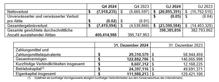 Die folgenden ausgewählten Finanzdaten stammen aus dem konsolidierten Jahresabschluss des Unternehmens und den dazugehörigen Anmerkungen (der "Jahresabschluss") für das am 31. Dezember 2024 endende Jahr sowie aus der Management’s Discussion and Analysis ("MD&A") für das am 31. Dezember 2024 endende Quartal und Jahr. Die Jahresabschlüsse und MD&A des Unternehmens sind unter www.discoverysilver.com und auf SEDAR+ unter www.sedarplus.ca verfügbar.