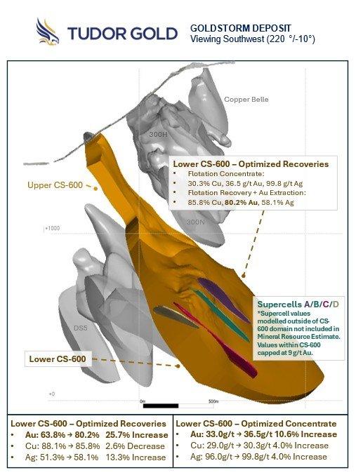 Ken Konkin, President & CEO von Tudor Gold, sagte zu den Ergebnissen: "Wir sind mit unseren zweiten Flotationstestergebnissen aus dem unteren Teil der Domäne CS-600 (CS-600L) sehr zufrieden. Wir schätzen, dass sich mehr als 50 % der Domäne CS-600 im unteren Teil (der Subdomäne CS-600L) befinden. Diese neuesten Ergebnisse sind vergleichbar mit dem ersten abgeschlossenen Zyklustest, den wir am 24. Oktober 2024 angekündigt haben. Mit einem einfachen Flotationsverfahren mit Grobreinigung sind wir durchgehend in der Lage, ein außerordentlich sauberes, hochgradiges Kupfer-/Goldkonzentrat mit ausgezeichneten Metallgewinnen zu produzieren, und bei den jüngsten metallurgischen Arbeiten konnten wir mit einem zusätzlichen Laugungsschritt deutlich mehr Gold gewinnen. Wir testeten die Flotationsrückstände und Pyritkonzentrate, indem wir sie einfach mit Zyanid auslaugten. Dadurch wurde eine beträchtliche Menge an Gold hinzugefügt, wodurch die kombinierte Goldgewinnung auf knapp über 80 % gesteigert werden konnte. Unser metallurgisches Team ist der Ansicht, dass eine weitere Feinabstimmung des Prozesses weiterhin zu einer höheren Ausbeute führen kann. Mehrere Tests haben gezeigt, dass eine höhere Goldausbeute mit einer feineren Mahlung verbunden ist. Bei diesen gemeldeten Gewinnungen wurde eine Korngröße von 75 Mikrometern verwendet. Die Subdomäne CS-600L befindet sich im selben Gebiet, das den neu entdeckten hochgradigen Goldkomplex Supercell-1 (SC-1) beherbergt. Unser technisches Team schließt zurzeit Elemente unseres nächsten Genehmigungsantrags ab, der den Bau einer Explorationsrampe vorsieht, die das Gebiet unmittelbar neben der Domäne CS-600 und direkt über den neu entdeckten hochgradigen Goldstrukturen von SC-1 durchschneiden soll. Der Vorschlag sieht den Bau einer drei Kilometer langen Explorationsrampe vor, die von unserem Gebiet Lower Camp aus erschlossen werden soll und es uns ermöglichen wird, den SC-1-Komplex effizienter zu erproben. Dies ist ein wichtiger Aspekt unseres Treaty-Creek-Projekts, da die zusätzliche Möglichkeit, eine hochgradige Goldlagerstätte mit mehreren Millionen Unzen zu definieren, das wirtschaftliche Potenzial des Projekts erheblich steigern würde, da wir dann mit einem wesentlich geringeren Investitionsaufwand in den Minenprozess einsteigen
