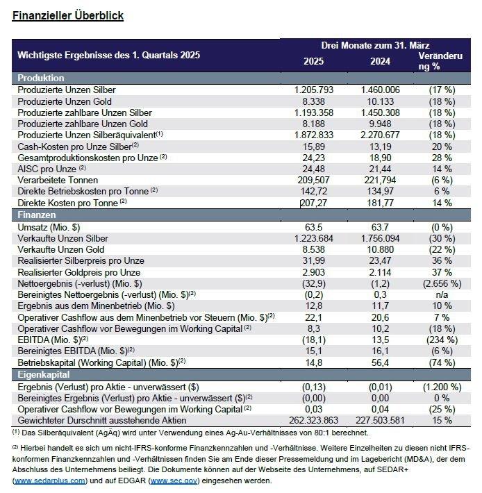 Diese Pressemeldung enthält bestimmte nicht-IFRS-konforme sowie andere nicht finanzielle Kennzahlen und Verhältnisse, einschließlich der Cash-Kosten pro Unze Silber, der Gesamtproduktionskosten pro Unze, die nachhalten Gesamtkosten („AISC“) pro Unze, der nachhaltigen AISC pro Unze, der direkten Betriebskosten pro Tonne, der direkten Kosten pro Tonne, der Cash-Kosten für Silber als Nebenprodukt, der Cash-Kosten für Gold als Nebenprodukt, des realisierten Silberpreises pro Unze, des realisierten Goldpreises pro Unze, des bereinigten Nettoergebnisses (-verlust), des bereinigten Nettoergebnisses (-verlusts) pro Aktie, des Cashflow aus dem Minenbetrieb vor Steuern, des Betriebskapital, des operativen Cashflow vor Bewegungen im Working Capital, des operativen Cashflow vor Änderungen des Betriebskapitals pro Aktie, des Gewinns vor Zinsen, Steuern und Abschreibungen („EBITDA“), des bereinigten EBITDA pro Aktie, des Erhaltungs- und Wachstumskapitals sowie des bereinigten Nettoergebnisses (-verlusts).