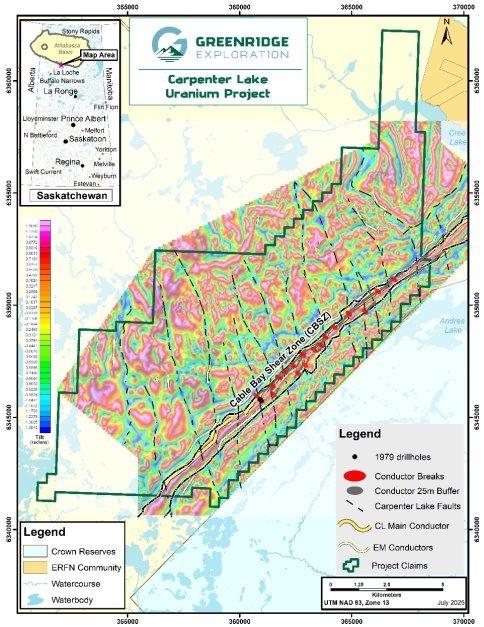 Carpenter Lake erstreckt sich über den südlichen Rand der Sandsteine der Athabasca-Becken-„Supergroup“ und umfasst mehr als 15 km der Cable Bay Shear Zone (die „CBSZ“) – ein markanter struktureller Bruch in Krustengröße, der von Nordosten nach Südwesten verläuft und hinsichtlich Uranlagerstätten weitestgehend unzureichend erkundet ist (siehe Abbildung 1). Die CBSZ ist von einer gut definierten leitfähigen Signatur, radiometrischen Anomalien und zahlreichen in der Vergangenheit kartierten Uranvorkommen geprägt.