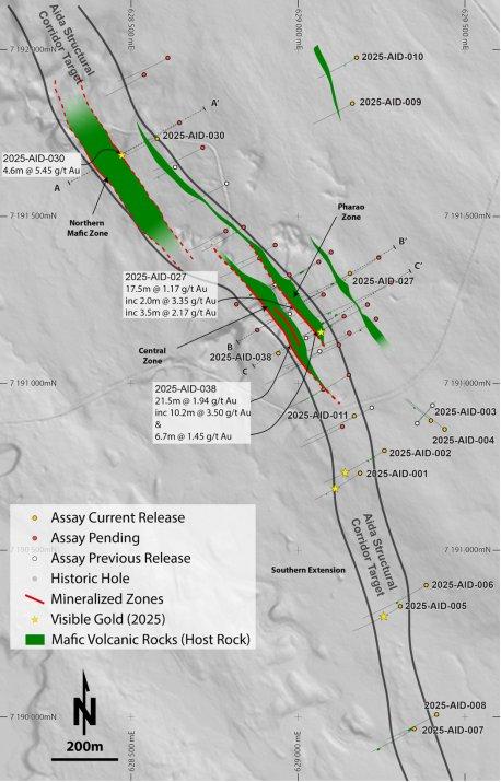 • Mehrere ausgeprägte Goldabschnitte durchteuft, einschließlich 1,94 g/t Au auf 21,5 m (2025-AID-038), 5,45 g/t Au auf 4,6 m (2025-AID-030) und 1,17 g/t Au auf 17,5 m (2025-AID-027)