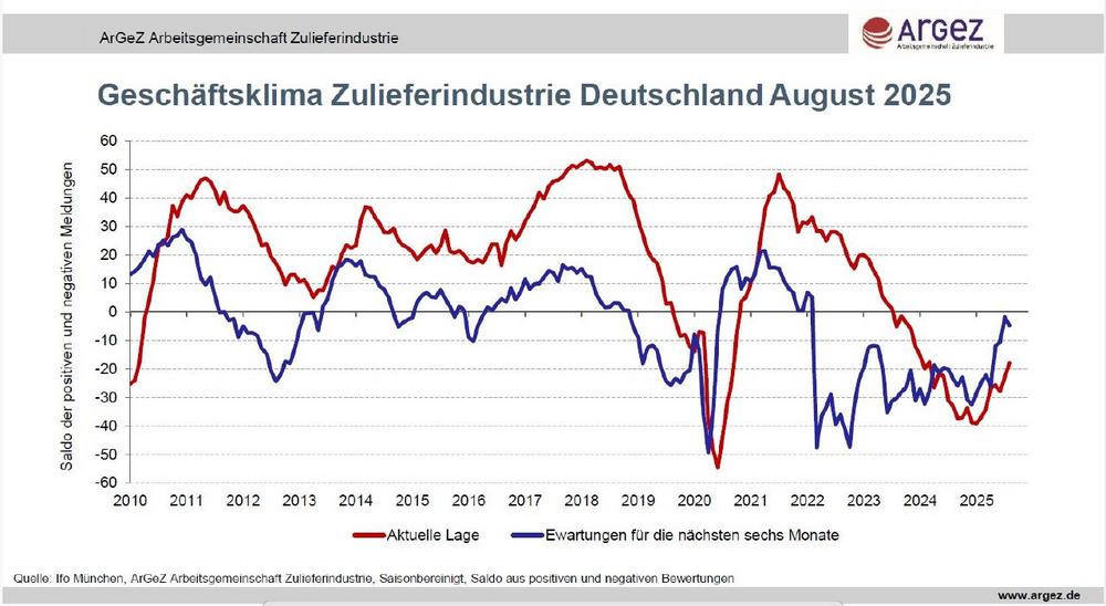 Das saisonbereinigte ifo-Geschäftsklima der deutschen Zulieferer steigt im August leicht an. Mit einem Plus von 1,3 Saldenpunkten erreicht es nun -11,4 Punkte. Damit verzeichnet die Branche den besten Wert seit Mai 2023, bleibt aber weiterhin deutlich im negativen Bereich.