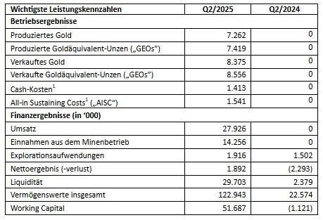 –          Produktion von 7.396 Goldäquivalent-Unzen (GEOs) im Q2/2025