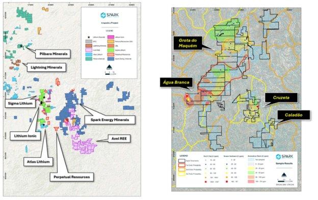 Drei Lithium-Ziele hoher Priorität – Cruzeta, Água Branca und Grota do Maquém – wurden identifiziert, in denen Lithium eine starke Korrelation mit Pfadfinderelementen (Cs, Sn, Rb) aufweist. Diese geochemische Verbindung ist typisch für reiche Lithium-Cäsium-Tantal-Pegmatite (LCT) und spodumenreiche Pegmatite (SRP). Diese Ziele repräsentieren die am besten entwickelten Lithium-Vorkommen in Sparks 91.900 Hektar großem Projekt Arapaima.