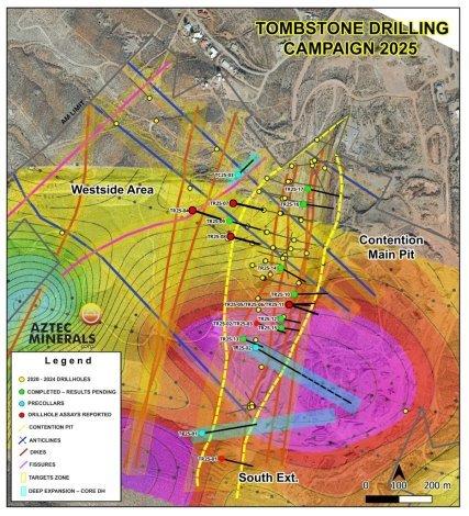 Die Hauptziele des Bohrprogramms 2025 sind: Expansion der bekannten Mineralisierung, horizontal nach Westen, Norden und Süden, abwärts über die in den Jahren 2020-24 von Aztec in der Grube Contention ausgeführten Bohrlöcher hinaus, mit Step-Outs zur Erweiterung der dort entdeckten oberflächennahen, mächtigen großflächigen Gold-Silber-Mineralisierung; die Prüfung der ersten tiefen CRD-Ziele durch Kernbohrungen und die Exploration neuer, im Gebiet Westside identifizierter Ziele durch erste Bohrungen.
