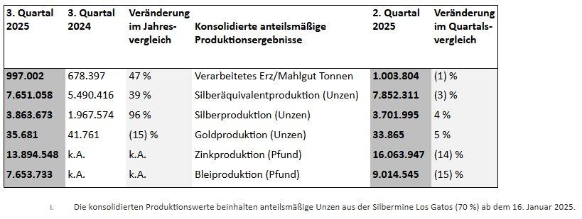 Diese Pressemeldung enthält „zukunftsgerichtete Informationen“ und „zukunftsgerichtete Aussagen“ gemäß den geltenden kanadischen und US-amerikanischen Wertpapiergesetzen (zusammen „zukunftsgerichtete Aussagen“). Diese Aussagen beziehen sich auf zukünftige Ereignisse oder zukünftige Leistungen, Geschäftsaussichten oder -chancen des Unternehmens, die auf Prognosen zukünftiger Ergebnisse, Schätzungen von noch nicht ermittelbaren Beträgen und Annahmen des Managements beruhen, die wiederum auf der Erfahrung und Wahrnehmung des Managements in Bezug auf historische Trends, aktuelle Bedingungen und erwartete zukünftige Entwicklungen basieren. Zu den zukunftsgerichteten Aussagen in dieser Pressemitteilung gehören unter anderem Aussagen in Bezug auf: den Zeitpunkt der Veröffentlichung der Finanzergebnisse des Unternehmens für das dritte Quartal 2025 und der Einzelheiten der Dividendenausschüttung des Unternehmens für das dritte Quartal 2025; den Zeitpunkt der Veröffentlichung weiter Ergebnisse der Explorationsbohrprogramme 2025 des Unternehmens; die Erwartungen des Unternehmens hinsichtlich einer starken Produktion in der Silbermine Los Gatos für den Rest des Jahres 2025, um seine überarbeitete Prognose für 2025 zu erreichen; das Ziel des Unternehmens, die Erzdurchsatzleistung in der Silbermine Los Gatos auf Grundlage der Betriebstage in der zweiten Hälfte des Jahres 2026 auf 4.000 Tonnen pro Tag zu erhöhen; und Einzelheiten zur Telefonkonferenz für Investoren im November 2025, um seine Produktions- und Finanzergebnisse für das dritte Quartal 2025 zu erörtern. Die Annahmen können sich als falsch erweisen und die tatsächlichen Ergebnisse und zukünftigen Ereignisse können erheblich von den erwarteten abweichen. Folglich können die Prognosen nicht garantiert werden. Die Anleger werden dementsprechend ausdrücklich darauf hingewiesen, sich nicht vorbehaltlos auf die Vorgaben und zukunftsgerichtete Aussagen zu verlassen, da es keine Garantie dafür gibt, dass die Pläne, Annahmen oder Erwartungen, auf die sich diese stützen, eintreten werden. Alle Aussagen, die keine historischen Fakten darstellen, können zukunftsgerichtete Aussagen sein. Aussagen über nachgewiesene und wahrscheinliche Mineralreserven und Mineralressourcenschätzungen können ebenfalls als zukunftsgerichtete Aussagen betrachtet werden, sofern sie Schätzungen der Mineralisierung beinhalten, die bei der Erschließung des Konzessionsgebiets angetroffen werden, und im Falle von nachgewiesene und angedeutete Mineralressourcen oder nachgewiesene und wahrscheinliche Mineralreserven spiegeln solche Aussagen die Schlussfolgerung wider, die auf bestimmten Annahmen beruht, dass die Minerallagerstätte wirtschaftlich ausgebeutet werden kann. Alle Aussagen, die Vorhersagen, Erwartungen, Überzeugungen, Pläne, Prognosen, Ziele bzw. zukünftige Ereignisse oder Leistungen zum Ausdruck bringen oder betreffen (oft, aber nicht immer, unter Gebrauch von Wörtern oder Begriffen wie „suchen“, „rechnen mit“, „planen“, „fortsetzen“, „schätzen“, „erwarten“, „können“, „werden“, „vorhersagen“, „prognostizieren“, „Potenzial“, „Ziel“, „beabsichtigen“, „könnten“, „dürften“, „sollten“, „glauben“ und ähnliche Ausdrücke), sind keine Aussagen über historische Fakten und können „zukunftsgerichtete Aussagen“ sein.