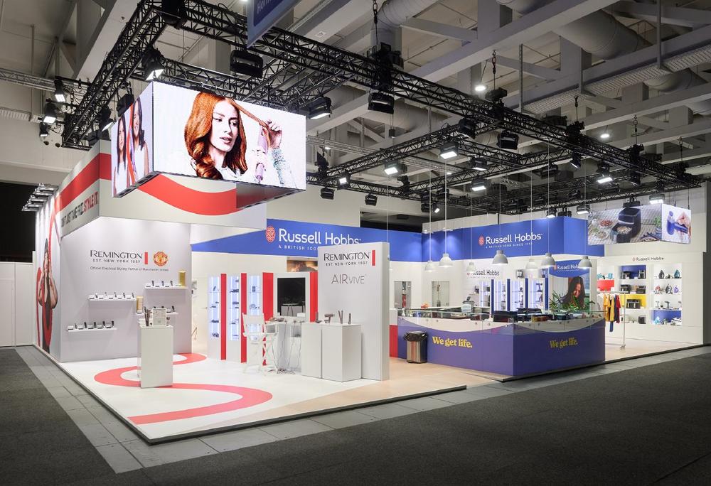 Die besondere Herausforderung: Zwei völlig unterschiedliche Marken – Remington, bekannt für hochwertige Haarstyling- und Groomingprodukte, und Russell Hobbs, Spezialist für stilvolle Küchen- und Haushaltsgeräte – sollten auf begrenztem Raum mit jeweils klarer Identität und hohem Wiedererkennungswert dargestellt werden.