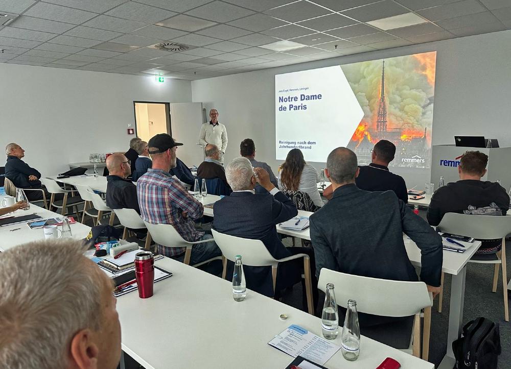 Der Vortragsblock der Fachveranstaltung bot einen kompakten Überblick über die Bandbreite denkmalpflegerischer Herausforderungen und Lösungsansätze. Den Auftakt gestalteten Stefan Haustein von Remmers und Prof. Dr. Dai Shibing (Tongji University Shanghai) mit einem Beitrag zur Restaurierungsplanung des Potala-Palastes in Tibet. Im Anschluss stellte Dr. Stefan Ullmann (Lowke Schiessl Ingenieure GmbH) die Sanierung der denkmalgeschützten Stadthalle Braunschweig vor. Dr. Markus Boos (Bernhard Remmers Institut für Analytik) zeigte auf, wie fundierte Analysen die Qualität von Ausschreibungen verbessern können, während Steinmetz- und Steinbildhauermeister Jens Kaminsky praxisnahe Hinweise zur fachgerechten Ausschreibung von Natursteinarbeiten im Bestand gab. Björn Koch (Nüthen Restaurierungen GmbH & Co. KG) präsentierte die Restaurierung der Elbebrücke Dömitz als Beispiel für den Umgang mit technischen Baudenkmalen. Ein besonderes Highlight war zudem der Vortrag von Jens Engel (Remmers) über emissionsfreie Reinigungstechniken zur Dekontamination bleibelasteter Innenwandflächen in der Kathedrale Notre-Dame in Paris. Den Abschluss bildete Cornelius Tarnai vom Ingenieur- und Planungsbüro Tarnai mit einem Einblick in das traditionelle Wissen alter Meister in der Bearbeitung von Stein und Holz.