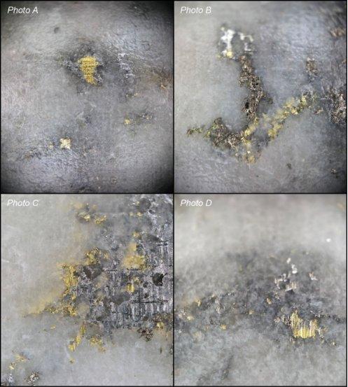 In einer Tiefe von 287,32 m unterhalb der intensivsten, weit verbreiteten Alteration und Mineralisierung wurde im Rahmen der Bohrungen ein unregelmäßiger Quarzerzgang mit geringem Neigungswinkel (10 bis 30° zur Kernachse) und einer Mächtigkeit von etwa 10 cm durchschnitten, der sichtbares Gold und Bismuthinit sowie disseminierten bis halbmassiven Pyrrhotin, Pyrit, Chalkopyrit, Arsenopyrit, Molybdänit und Sphalerit beherbergt (Fotos 1, 2 & 5).  Die Kernprobenahmen des Quarzerzgangs ergaben 1,25 m mit einem Gehalt von 105 g/t Gold. Unmittelbar vor dieser Probe wurde aus einem zweiten Quarzgang mit einer Mächtigkeit im Zentimeterbereich sichtbares Gold innerhalb einer Zone aus alteriertem und gemasertem Granodiorit angetroffen (8,85 g/t Gold auf 1,15 m).Im Liegenden der mit grobkörnigem Gold angereicherten Erzgänge wurde in einem 0,75 m breiten Abschnitt (288,50 m – 289,15 m Tiefe) ein Goldgehalt von 0,47 g/t ermittelt.