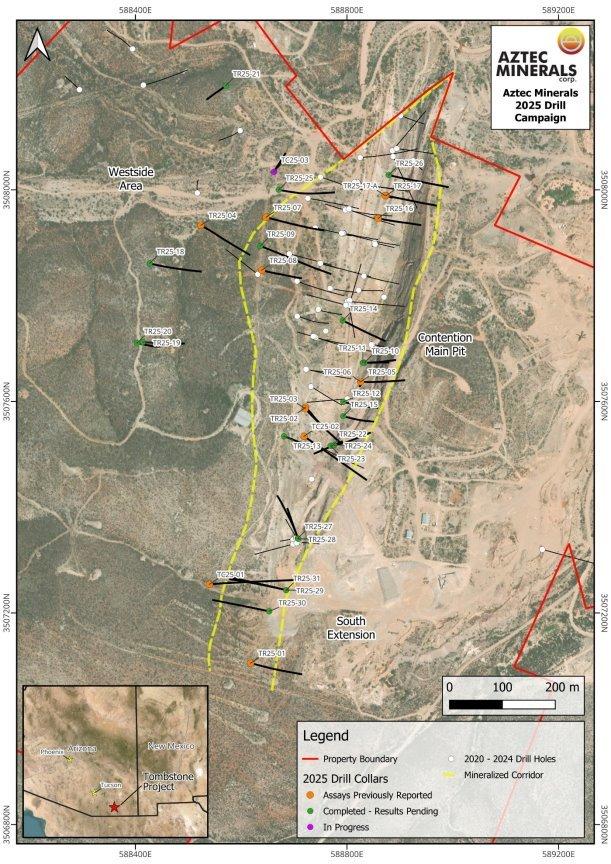 Aztec Minerals Corp. (AZT: TSX-V, OTCQB: AZZTF) („Aztec“ oder das „Unternehmen“) gibt ein Update hinsichtlich des laufenden Reverse-Circulation- und Kernbohrprogramms im Konzessionsgebiet Tombstone im Südosten von Arizona bekannt. Im Rahmen des Bohrprogramms 2025 wurden nunmehr 34 RC-Bohrlöcher abgeschlossen, wobei 13 Bohrlöcher bereits gemeldet wurden (siehe Pressemitteilungen vom 14. August, 23. September und 31. Oktober 2025). Im Rahmen des Bohrprogramms wurden bis dato 5.960 m an RC-Bohrungen und 495 m an Kernbohrungen abgeschlossen. Das Unternehmen verfügt zurzeit über 21 RC-Bohrlöcher, die auf ihre geochemische Analyse im Labor von Bureau Veritas warten.