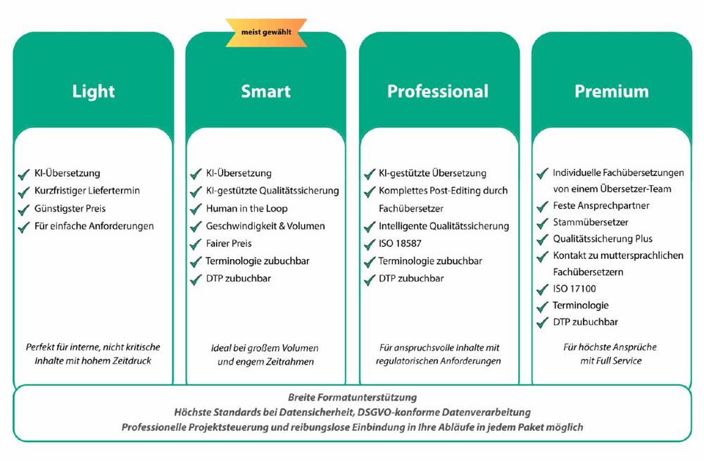 Sie möchten Ihre Inhalte schnell, zuverlässig und wirtschaftlich übersetzen lassen? Mit unseren vier Übersetzungspaketen erhalten Sie genau die Unterstützung, die Sie dafür brauchen – kombiniert aus professioneller Fachkompetenz, moderner Technologie und klaren, transparenten Prozessen. Sie definieren Ihre Anforderungen und wählen dann das für Sie passende Paket aus – der Schieberegler für Budget, Zeit und Qualität liegt in Ihrer Hand.