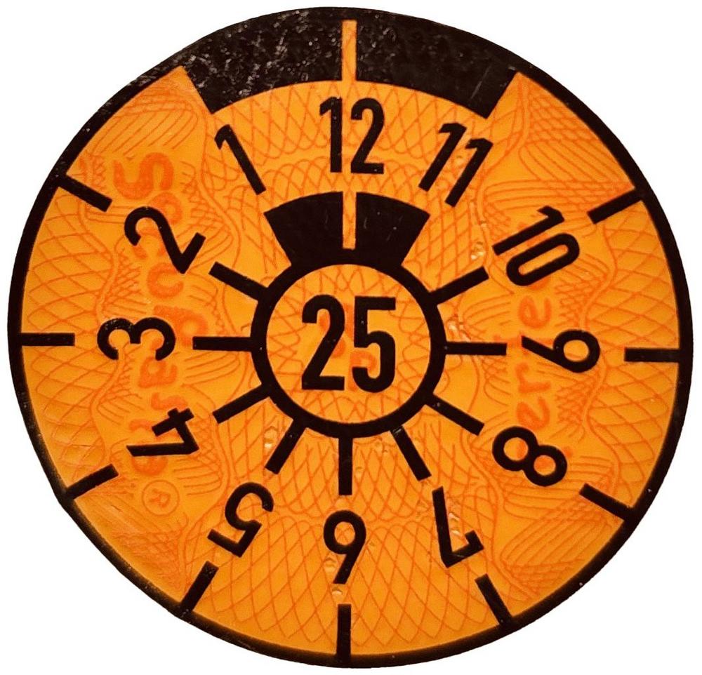 Die orangefarbenen Prüfplaketten mit der Zahl 25 auf den hinteren Kennzeichen von Autos, Anhängern, Motorrädern und anderen Kraftfahrzeugen laufen zum Jahreswechsel ab. In welchem Monat genau, das erkennt man an der Zahl, die nach oben zeigt – zum Beispiel 12 für den Dezember.