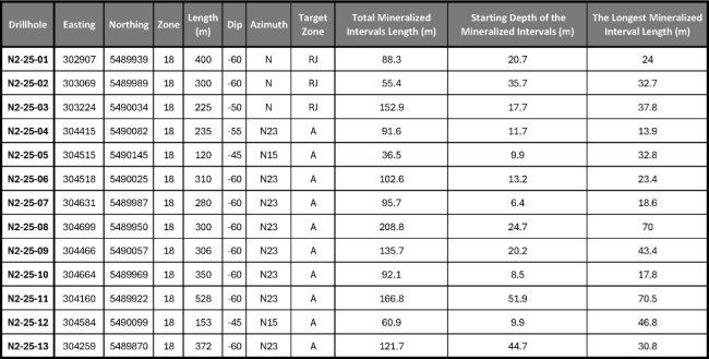 Darüber hinaus wurden in jedem der anderen Bohrlöcher lange mineralisierte Abschnitte beobachtet, wobei N2-25-01, N2-25-04, N2-25-07 und N2-25-10 insgesamt mineralisierte Abschnitte von mehr als 80 Metern ergaben, wobei die Mineralisierung innerhalb der ersten 10 bis 20 Meter begann.