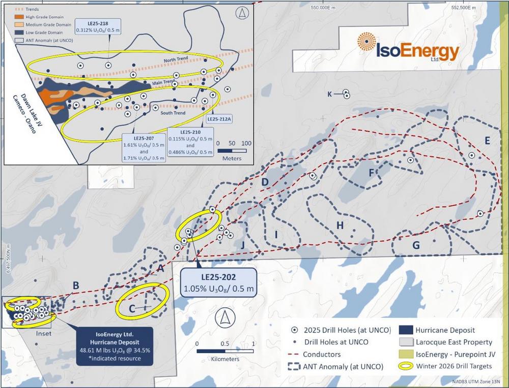 • Greenfield-Ziele: Es sind Bohrungen geplant, um die Bohrung LE25-202 aus dem Jahr 2025 weiterzuverfolgen, die 1,05 % U3 O8 über 0,5 m in einer Tiefe von etwa 20 m unterhalb der Diskordanz 2,8 km östlich von Hurricane durchschnitten hat. Dies ist der stärkste mineralisierte Abschnitt, der außerhalb des Hurricane-Lagerstättengebiets im Rahmen des Projekts gefunden wurde (siehe Pressemitteilung vom 3. Dezember 2025).