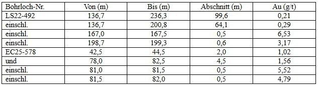 [3] Die geschätzten wahren Mächtigkeiten („ETW“) für die gemeldeten Gangabschnitte basieren auf hochgradig zuverlässigen orientierten Kernmessungen einzelner Gänge, sofern verfügbar, oder auf gemessenen Winkeln senkrecht zu den Gangrändern. Die ETW-Gangabschnittswinkel stützten sich auf Geometrien, die anhand einer 3D-Modellierung der Goldmineralisierungshülle unter Verwendung von Konturen mit einem Gehalt von 0,2 g/t Au geschätzt wurden, und stimmen mit diesen überein. Die gemessene und modellierte durchschnittliche Neigung des „geschichteten Erweiterungsgangs“ beträgt 35o in nordöstlicher Richtung, und der typische Neigungswinkel der Bohrlöcher beträgt 55o in südwestlicher Richtung. Möglicherweise sind weitere, potenziell schräg verlaufende goldmineralisierte Erzgänge (z. B. „Quarz-Brekzien-Erzgänge“) vorhanden. Die Unterschiede zwischen den einzelnen ETW und den bohrlochabwärts verlaufenden Abschnittslängen können je nach Azimut und Neigung des Bohrlochs, den Variationen im Streichen und Einfallen der Gangzonen und den Gesamtgeometrien der verschiedenen Gangsysteme zwischen den Bohrlöchern variieren.